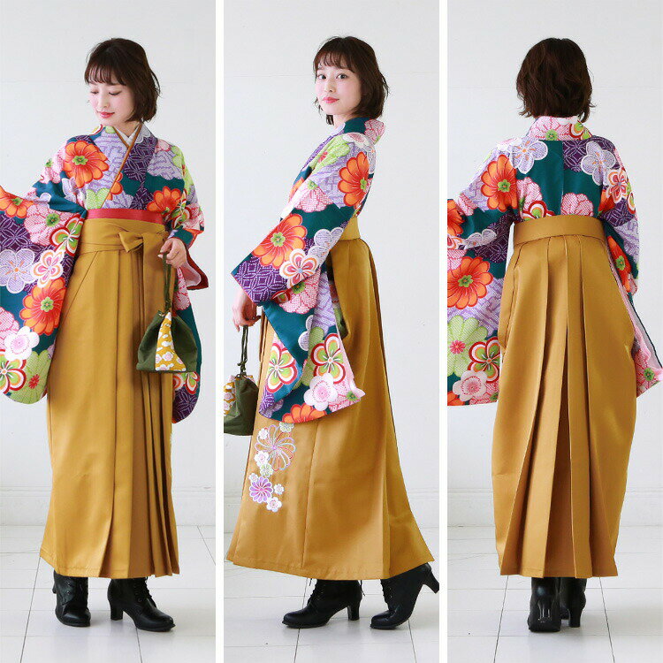 ・セット内容着物・袴・草履orブーツ・巾着・長襦袢(半衿付)半巾帯・着付け小物(腰紐2本コーリンベルト・伊達締め2本衿芯・帯板)・重ね衿・和装用肌着ソックスタイプ足袋(プレゼント)・対応身長(サイズ)袴SS:145〜150cm(袴約84cm)S:150〜155cm(袴約87cm)M:155〜158cm(袴約91cm)L:158〜163cm(袴約95cm)LL:163〜168cm前後(袴約99cm)・サイズ二尺袖着物(フリーサイズ)身丈:約109cm袖丈:約76cm裄丈:約69cm※ご予約前に必ずご確認下さい。